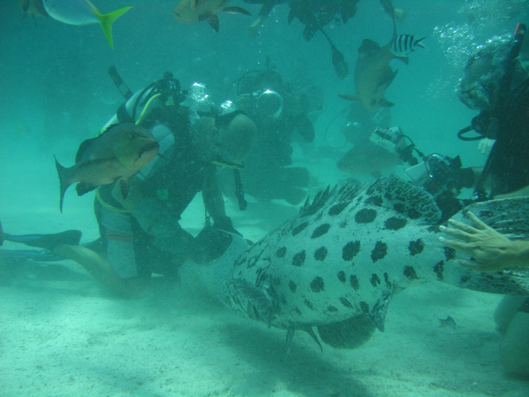 BGR içi dalışlar ki bunlardan biri olan Cod Feed çok heyecanlı. Potato Cod adı verilen bizim orfoz veya hani balığı benzeri, hafif irice (ki 2m boyunda ve 120 kg’a kadar olanları dalışlarımızda mevcuttu, elle besleme ve sevme şansına sahipsiniz) balıkların beslenmesi.