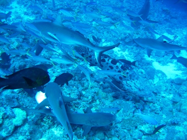 GBR dışı dalışlarda en mükemmler yer kesinlikle Osprey Reef (beslemenin de yapıldığı bölge). Zaten buraya ulaşıldığımızda Andy (dalış direktörü), eğer ilk dalışta köpekbalığı göremiyen birisi olursa onun parasını iade ediceklerini söylemişti, ki tahmin edersiniz böyle birşey olmadı. Görüş, su altı için inanılmaz sayılabilicek değerlerde neredeyse 30m, ve besleme tam anlamıyla bir çılgınlık, gerçek adrenalin bu olsa gerek, karşınızda 60’a yakın köpekbalığı (Grey Whaler, Lemon, Nurse ve Whitetipler benim ayırt edebildiklerimdi), dev Cod’lar, Sniper türü iri balıklar ve daha aklınıza gelemiyecek miktarda küçük balık. Yaklaşık 20 dk süren bir beslenme çılgınlığı, müthiş keyifli. Köpekbalıkları ile arası iyi olanlar, kaçırılmıycak bir fırsat.